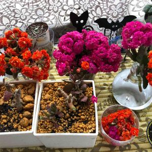 昨日の強風でカランコエパーフェクタの鉢が落ちました。 元々花が重たそうなところに落ちたのものだから、全体的にムチウチみたいになっちゃって、もう枝を切るしかなかった💧 手前の鉢が初めての切り戻しです。 その後ろは、どれか根がつかないかな、と枝にメネデールあげてみました。 骨折した花は花手水みたいにしてみました。 ホントに悔しい😭