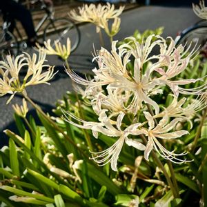 今日のお花🏷️ネリネ キラキラと光沢のある花びら✨のダイヤモンドリリー。💎というより雲英(きら)の輝き。毎年観察している近所の民家の玄関脇花壇の大株です 09月25日📸ヒガンバナと同じ時期ですが花はふた周り大きいです。自転車を停めて夢中で撮った写真に待ちくたびれた夫が写りこんでいる꜀(𖦹.𖦹)꜆💦