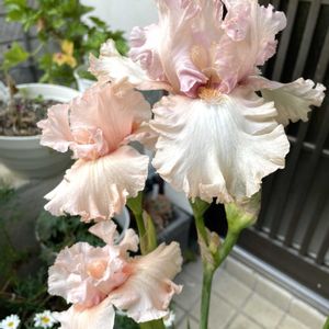 𖤣𖥧𖥣。𖥧 𖧧𖤣𖥧𖥣。𖥧 𖧧𖤣𖥧𖥣。𖥧 𖧧𖤣𖥧𖥣。 ジャーマンアイリス 虹の花🌈🌈🌈🌸🩷 昨晩からまた雨が降る予報だったので地植のストロベリーシェイクは 全部開花しそうだったので カットして玄関に飾りました。 軒下に持ってきた ピンクベイションと記念撮影🌈 右側 ピンクベイション 左がストロベリーシェイク