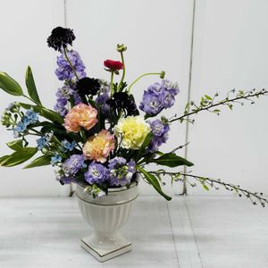 コンポート使用 フリーデザイン 生花使用 設置の場所を考えて✨ 枝をばらし角度を変えて生けてみました