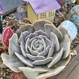 花福袋に入っていたイケベリア。レウレシアと迷いましたが初めて育てます。多肉初心者。後ろの紫色の屋根は木で作りセメダインで仮止め。ところが孫が中に土が満タンに入っていました。新しい物を置くとイタズラの餌食になります