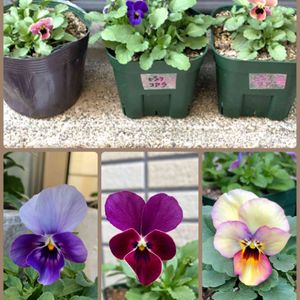 街の花屋さんで、左上のポット苗を見つけて、虹色マニアの私は背を向けられず連れ帰りました😆 どちらの色も伸び伸び育って欲しいのでオペして分けました 虹色ちゃん、挿し芽だったかも〜💧貧弱でした😢無事に育って(>人<;) 下の段は昨年のうちのビオラからの種まきっ子です💓 左からエボルベ、レディ、モココ、けっこう親に似てて、会えて嬉しいです♪̊̈♪̆̈