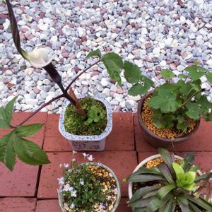 放置されてた祖母の盆栽から花と芽が出て来てた‼️ 庭の水遣りの時、ついでに水をあげてたお陰ですかね❓ 花はテルナミ、葉は見たことあるけど不明。