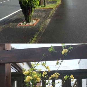 上:朝の散歩で雨上がりの並木道、モリゾーキッコロの世界。 下:モッコウバラの黄色が、咲き始めた。フェンスいっぱいに巻きついて欲しい☝🏻️✨
