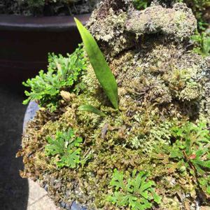 ヤツデの下葉を整理してたら オモトの赤ちゃんがコロニー付きでコロがっていたので、いやコロがしたのは僕かな❓ 鉢にコケとイワヒバとをセットしました。即席盆栽‼️ 万年青(オモト)は、弱ってるので果たして復活してくれるか、乞うご期待。