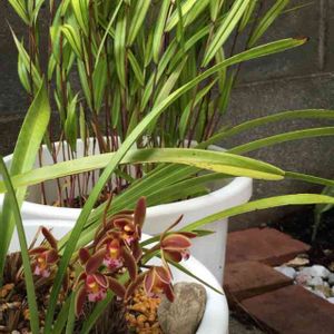 ランの花が咲いた❣️ 2鉢に根詰まりしてたのを株分けして5株地植えと小さい3株鉢に残したら鉢の方が早く咲きました✨ 地植えの方も1株には蕾がついてました👍🏻
