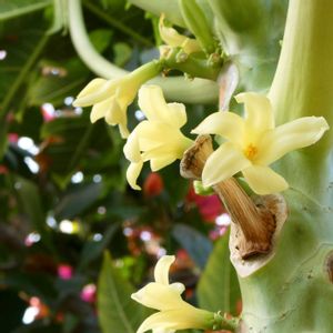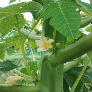 雌雄異株ですが コレは両性花を付ける品種です。 雌花は約4~5cmの花 ③外観は丸く果実になる子房が 一体になってます🎶 ✳️同じ品種の中には〰︎ 雌株と両性株が存在する。 両性花は自家受粉し着果します ✳️完熟する前の未熟な状態で 収穫され 主に野菜として利用 (青パパイヤ) パパイヤの花 パパイア科