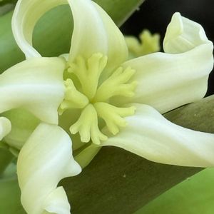 「パパイヤの花」 これは”雌性花”で、雄しべと花粉が無く、柱頭が大きく裂開してるのが雌性花。果実になる子房と一体になって成長する。 ※両性花もあるそうですがここでは見当たらない。 ※両性品種には雄性は存在せず、両性もしくは雌性のいずれも実がなる ※雌性花と両性花では果実の型が違うそうですが❓ 咲くやこの花館5/23