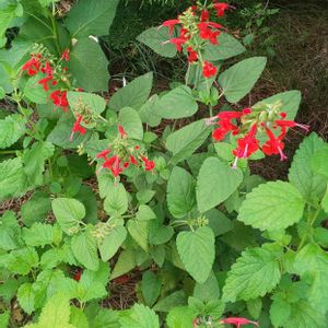 サルビアのコクシネアシリーズは まだフェンスのとこで咲いてます- ̗̀ ♡ ̖́- 奥に見えるのは野生化ワイヤープランツ(oロo)!! 抜いても生えてきてカットしてます꒰ •ω• ꒱゚+。:.゚ஐ♡
