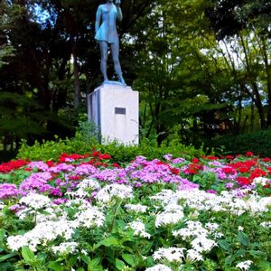 尼崎市上坂部西公園 少女像の周りに三色のペンタスが咲いています。