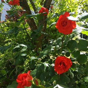 バラtintin 房咲きが満開になりました✨ 朱色のばらで、お習字の直しを思い出す色デス。😂