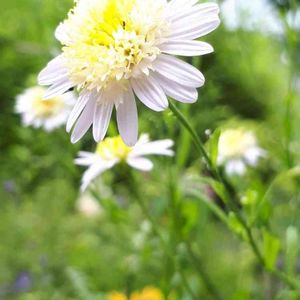 カーリメリス七変化 春には一重の白い花が 夏には八重の白い花になり、 涼しくなると八重の薄いブルーの花に変化します。 キク科なので地下茎でどんどん増えます。