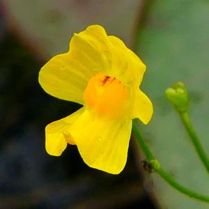 【大花犬狸藻】《タヌキモ科》 葉は羽状に分かれた細い糸状で、 互い違いに生える(互生)。 捕虫嚢を持つ食虫植物で、 ミジンコなどを捕らえて消化・吸収する。 花茎の高さは10~20センチくらいである。 花茎の先に総状花序(柄のある花が花茎に均等につく)を出し、 黄色い花を疎らにつける。 大狸藻(オオタヌキモ:Utricularia macrorhiza)と犬狸藻(イヌタヌキモ:Utricularia australis)との雑種と考えられている。 属名の Utricularia は「utriculus(小気胞)」からきている。 小さい捕虫嚢のあるという意味。 種小名の japonica は「日本の」という意味である。