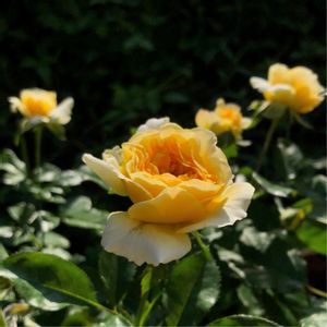 バラ*ポラリスアルファ、 現在、玄関前特等席です(^^♪ 輝いてますね☆彡 もともと大きな花(大輪)を望んで買ったわけではないので 小さな花でも、とても楽しんでいます。 小さいけれど、とても整った形で咲き進むとモリモリ♪ 写真の花で、5~6cmくらいの花径。 今朝撮った写真です。 今日は、日が差したり、通り雨(豪雨)が降ったり、 それを何度も繰り返すような、変な一日でした(^^;; バラ*ポラリスアルファのシュートは、 この写真に収まっていません(^^;; 写真の外、左上方に伸びていますよー。 *以下、ポラリスアルファのご紹介* →のあとの記載は、6月から育ててみての感想等です。 国・会社:独・タンタウ →タンタウのバラは初めて! 系統:四季咲中輪系 →写真は細い枝からの開花部分なので 房咲きになっていません 花形/花弁数:丸弁ロゼット咲き/60枚 →小花でも、整った花ですし、花弁数多いです! 小花でも楽しめるバラです♪ 花径:8cm →条件が良くないとここまではならないかも 樹高/樹形:0.8m/半横張り性 →シュートを一度ピンチして、 2段目につぼみがつくと0.8mくらい 芳香:中香 ティーの香り →爽やか~いい香りです♪ 耐病性: うどんこ病→一部発生しましたが、 転移しないので被害は最小限でした。 黒星病→ほとんど発生していません! 輝くような明るい黄色の花は、丸みのある濃い緑色の照葉とのコントラストで、一層明るく輝いて見えます。ティーの優しい香り。花名は、北極星の名前です。2015年マドリード国際コンクールグランプリ他、多数受賞。