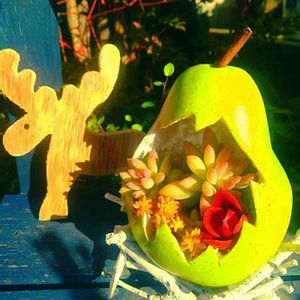 洋梨の造花をくり抜いて 聖夜つづりのかまくらにしました。 聖夜つづりは割と大きくなる多肉だけれど、1回冬にほとんど枯らしてしまったので、今年は幼苗をこのまま部屋にしまいます。