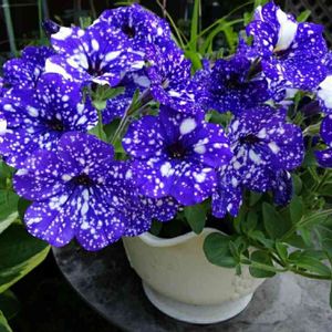 夏の夜空から落ちてきたような 『ペチュニア・ナイトスカイ』 深いブルーの花びらに 不規則な白い模様が入り 星が煌めく夜空のよう ひとつとして同じ花姿はなく 全て違った小宇宙