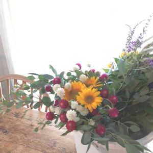 こんにちは。🎵 ブーケを2個作りました。💐💐 病気と戦ってる親友のbirthdayプレゼントです。🎀 こっちは親友のお母さんにプレゼント。💐毎日、ご飯や家事お疲れ様です。ありがとうございます。と心を込めて。❤向日葵🌻で元気になっていただきたくて。(*´▽`*)💛