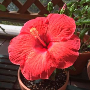 この夏、ひとつめのハイビスカスが咲きました。 四年目のハイビスカス、毎年バッサリ選定するのにグングン伸びて、元気な花を沢山咲かせてくれます。 暑さもふっとぶ可愛い花☆*:.。