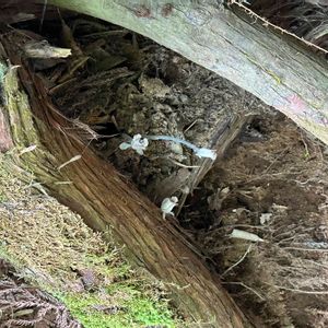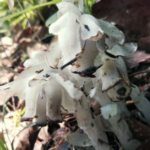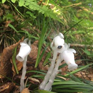 ギンリョウソウ 別名 ユウレイタケ 🌱ツツジ科 ギンリョウソウ属 ✽葉緑素を持たない菌寄生植物で高さ8〜15cm ✽全草が蝋細工のような透明感のある白色 ✽茎は直立して楕円形で鱗片状の葉が多数互生する ✽花は横向きに1個つき、長さ2cmほど葉と同形全縁のがく片が2〜3個、花弁が3〜5個ある 果実になり始めてるのも有りました。 右上が何かの動物に見えてしいます😆
