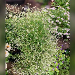 猛暑の夏、多肉ちゃんだけでなく、 お花もたくさんだめにしてしまった😿 その中、元気に咲いてるのを 見ると健気で愛おしくなる🤍 1⃣ニュードーン 2⃣日日草 フェアリースター 後ろに黄緑のラインの入る 種類を1苗植えてます🤍 名前🏷どっか行った? 寄せ植えにするつもりが中々できず、 弱ってきたから地植えに🌼