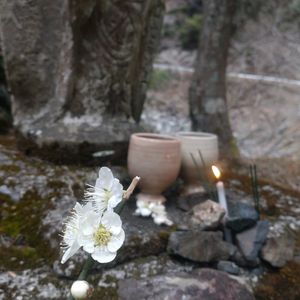 山奥自宅から隣町の渓谷へ 山深く道を行き 深く深く渓谷に入る 老母の人生に大きく影響し、我が家の歴史の中で言い伝えられている大切な大切な方の亡くなった場所 もう亡くなって80年 3月21日が命日 その謂れを幼い頃から聴かされてきた 山奥自宅のシキミと梅を供え、静かに老母と手を掌わす 「想い偲び祀る心は伝わり、何かを知らせて下さる時、それを感じる心を私達は持てる」 と老母は言う 梅の香りを共に