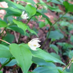 山奥自宅集落山道にて チゴユリ群落すぐ下にハナイカダの木が3本ある 花が二つ付くってことは実も二つ付くってこと? ってハナイカダにきく
