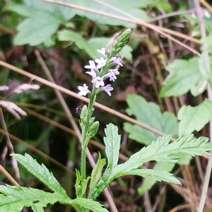 熊葛 クマツヅラ クマツヅラ科 クマツヅラ属 分布 本州四国 九州 沖縄 在来 花期 6〜9月 在来種 丘陵地の田圃と車道の間の側溝のコンクリートの溝にポツポツと並んで生えている。 他では見たことがありません。 冬にも黒ずんだ茎に黒ずんだ果実殻をつけています。 小さな花で茎も長く風に揺れてなかなか写せません。 風除けの為、錆びたガードレールをバックに。 撮影 2025/5/18