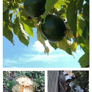 ↘️ アボカド1個収穫 486g ⬅️ リス君 1個収穫 今日は電柱の上で作業しています ↗️ パパイヤの葉を食べて育ち羽化したスズメガの蛾Erinnyis ello または Ello sphinx 幼虫の数は5匹