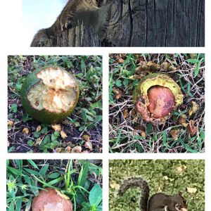 アボカドとリス かじられたアボカドを放置して様子を見る 9月25日 まだ白い 10月3日 熟して緑色 10月4日 種のみ 10月6日 咥えて運ぶ これからは全部拾わず残しておこうと考えます