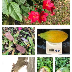 ⬆️提琴桜と松葉 ⬅️松の種がひらひらと舞い降りました ➡️パパイヤ収穫468g 8個目 ↙️リスがアボカドのタネを咥えています ↘️新に2個のアボカドがかじられました