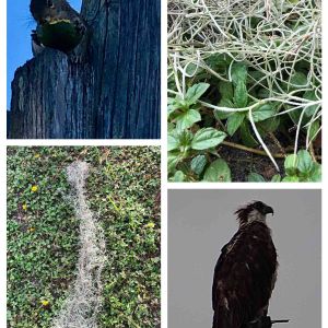 ↖️リス君はアボカドを1個確保しました ↘️ミサゴかもしれません 長さ120cmスパニッシュモスが落ちていたので、拾って枝に掛けました 全長とアップのpicです