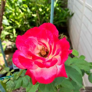 今朝の🌹バラ ダブルディライト。 超強香品種。 甘い香りじゃなくて、 その昔あった、バラの香りのガム。 そんな感じの香り。😄😅😅 花が大き過ぎ、手でサポート。😄