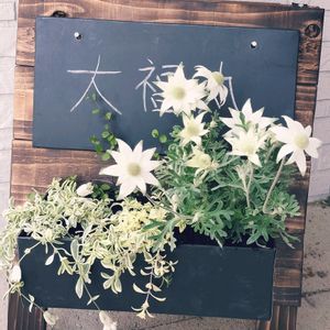 プランター付きの看板を作ってもらい、大好きなフランネルフランネルフラワーとシレネを寄せ植えしました♡
