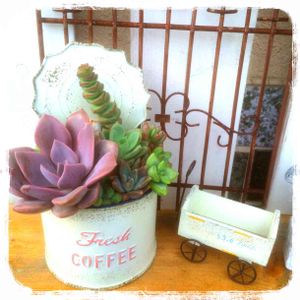 Instagramでお友達になった方からいただきました^ ^ 可愛い多肉さんとオサレなリメ缶とくる殻ピック♡♡