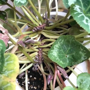 お花が終わりベランダの軒下に移動したシクラメンさん🍀 この夏乗り切れるかなぁ?? でもでも👀💗👀💗👀💗 新芽がいっぱい出てきてる〜👀💗