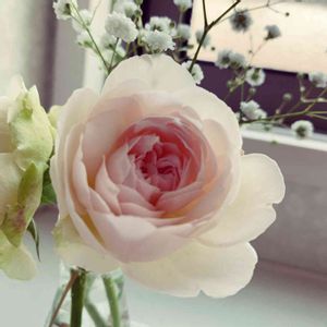ネットで一目惚れ。探しまくってようやく手に入ったアッサンブラージュ♡短くて、切り花にしにくいんだけど、虫食いが激しくてほぼ葉がないので、蕾のうちに切ってみました。ダイソーで見つけた、小さなフラスコに飾ってみた。 アッサンブラージュ 四季咲き中輪系 フロリバンダ(FL) F&Gローズ ローズアロマティーク 作出国: 日本 京阪園芸作 発表年: 2018 年 花色: 白い舟弁中央ピンク 花径: 約8cm 樹高: 1.2〜1.3m 芳香の強さ: ダマスク&フルーツの香り