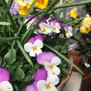 びろーんと伸びたムスカリの襲撃にあう 花盛りのパンジー &ビオラ 。 鉢の中央に植えたムスカリの葉が暴れてます💦 この葉っぱはあんまり好きじゃない😑 元々こういう葉なのは分かっているけど、 シャキッとしてほしいと無理な希望を持ってしまいます。