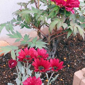 おはようございます😊 宿根草の🍀アークトチス🍀が咲いてます♥♥♥🌿ワインカラーがとても綺麗です😍 後ろの牡丹は、花が終わったら種が出来て株に負担がかかるので、花のすぐ下でカットします😌✁
