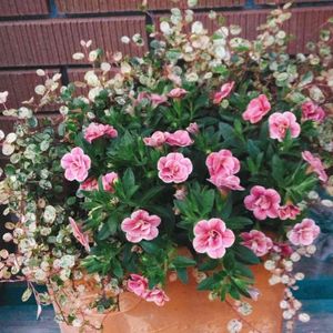 🍀ダイアンサス・ピンクキッス🍀と🍀斑入りワイヤープランツ🍀の寄植えです😊 ダイアンサスの可愛いピンク色が、気に入ってます💕 ワイヤープランツは、3シーズン目です😉