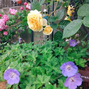薔薇の庭に宿根草の🍀ゲラニウム🍀が紫色の花を咲かせています😊 今年も、葉をいっぱい広げて、花をたくさん咲かせてくれそうです🤗💞