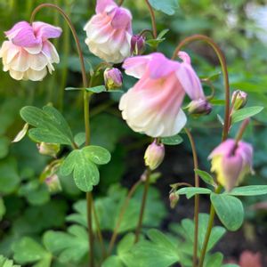 今日のお花オダマキ うちで今咲いてるのは ➀ウィンキー💜3年目? ②➂この春お迎えした姫オダマキ🩷 少し前のpicです その他はまだ蕾の我が家 ➃ギボウシ&ヒューケラ 母の形見のギボウシ💚 リーフが綺麗な季節です