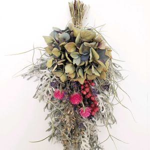 ドライフラワーにできる植物を少しずつ増やしていき、ペッパーベリー以外は庭やエントランスで育った花や葉を使って、自家製のスワッグを作ることができました。