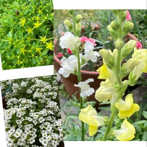 今日のお庭のモリモリさんです(ง °Θ°)ว 勝手に地面に広がって、小さいお花も咲かせているセダム モリムラマンネングサ💛 うちに来て2年目のアリッサム🤍 種から育てたキンギョソウ💛🤍 まいた場所以外にもこぼれ種で、あらゆる場所からキンギョソウが〜😂🌱🌱