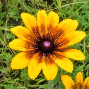 おはようございます😃 今の季節、散歩で、畑の隅、道路の端、庭などどこでも出会う黄色い花。 これは花の中央部、頭状花が盛り上がっています。 オオハンゴウ属、ルドベキアヒルタだと思います。 舌状花の付け根に斑点があるタイプのようです。 葉っぱを見ると、ヒマワリ属の幅広の葉っぱとは違って細いです。
