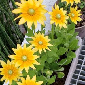 近所さんのお花 ルドベキア・ヒルタ プレーリーサンという品種 Rudbeckia hirta 'Prairie Sun' まさに大草原の太陽☀️ 鮮黄橙色のお花の真ん中が緑色のお目め💚、ヒマワリと違って花の向きを気にすることなく楽しめます🎶 1年草だというのがちょっと残念💔