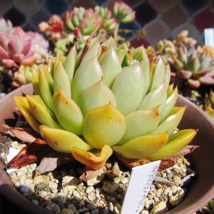 【エケベリア属 アガボイデス プリドニス】 Echeveria agavoides pulidonis Echeveria agavoides×pulidonis アガボイデス×花うららの交配種 ネームタグは、 【アガボイデスプリドニス】 お店の売れ残りをずっと スルーしていたのですが、 綴化っぽくなっていたので 興味本位で購入⁽⁽◝( •௰• )◜⁾⁾ 【クリスマス(E. 'Christmas')】 Echeveria agavoides 'Christmas' ☝の名前で同じ交配式の アガボイデスの血が強い 園芸種がありますが、 これをこの名で呼ぶのは 日本だけだそうです