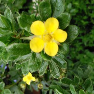 【金露梅】《バラ科》 花言葉 「優美」「短い恋」 別名 ブッシュ・チンケフォイル キンロバイの花は、茎先や上部の葉腋に集散花序を出し、1~3個の花を付けます。 花は径2cm~3cm程の黄色い5弁花で、 花弁は丸く花床は半球形で長い毛が生えます。 萼片も5個あり、長さ5mm程の三角状卵形で、外側は白い毛で覆われています。 雄しべは黄色で普通20本程あります。 キンロバイという名前は、花が黄色で、「ウメ(梅)」の花に似ていることから名付けられました。 また、本種キンロバイには変種が多くあり、園芸品種として植栽される品種に、白い花を咲かせる「ハクロバイ(白露梅)」があります。 こちらはキンロバイに対して別名「ギンロバイ(銀露梅)」とも呼ばれています。