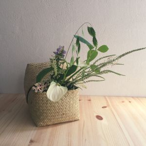 『カゴにいける』 枯れた植物でできたカゴは、フレッシュで力強い夏の草花たちとよく合う気がします😌 カゴにもいろいろありますが、日用雑貨のようなカゴにいけるのが最近の私のブームです🍀 (白い花はオカトラノオでしょうか。わかる方がいましたら教えてください🙏)