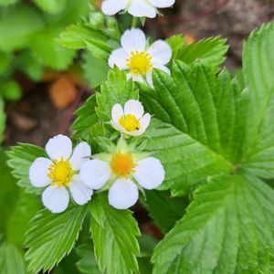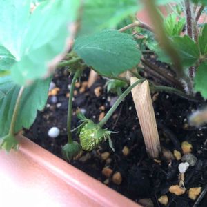 こんばんは🌛 我が家のワイルドストロベリーに実が付き初めました。 小さくて酸っぱい実ですが、せっかく実ったので全て食べますΨ( 'ч' ☆) 繁殖力が強く、雑草が生えにくいらしいですが…ほかの花が負けそうでちっちゃく咲いてます😅