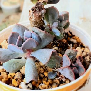 今回鉢がメイン的な… 可愛い鉢が増えて来たので 植えましたよ😊 2.3枚目は同じ鉢の裏表 4枚目寄せ植えに入れようと思ったら 子株ちゃんが2つも付いていたので おひとり様へ発根したて…チョロ根 窓際の温かい所に置きます😊